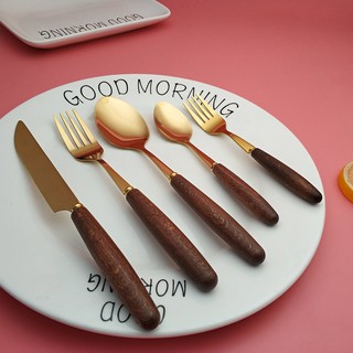Hot New Style Wooden Handle Gold Plated Stainless Steel Table Knife Table Fork Soup Spoon Coffee