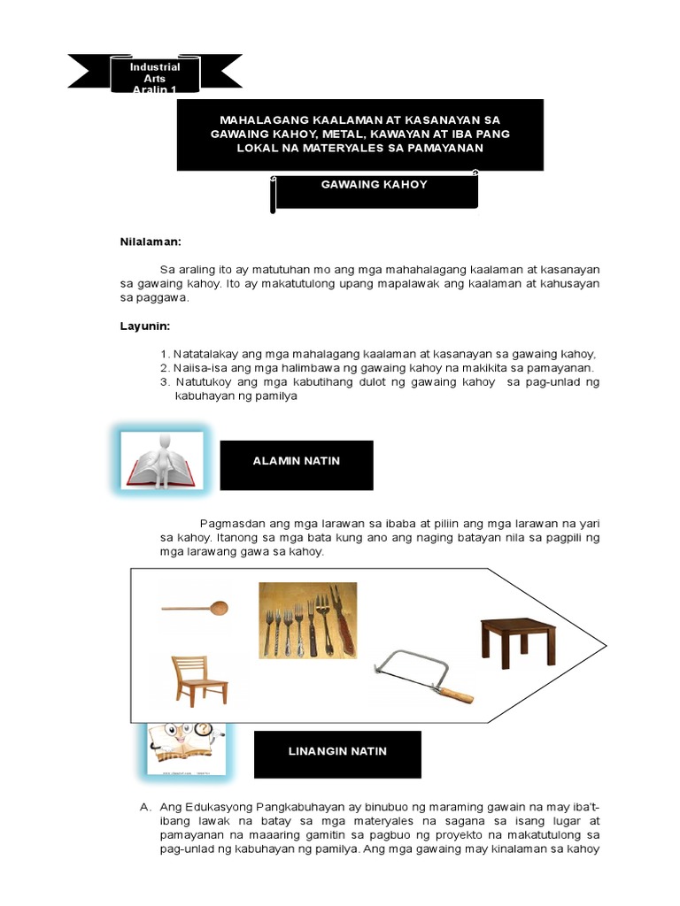 Aralin 1 Batayan at Kaalaman sa Gawain Gamit ang Lokal na Materyales Iba-ibang kasanayan ang lilinangin at pauusbungin sa bawat mag-aaral ito ang gawaing-kahoy gawaing-metal at gawaing-pang-elektrisidad upang makatulong sa pamilya kapag lubos na ang kaalaman at kasanayan sa mga gawaing ito. Halaman punong kahoy hindi kinakain ang bunga. Unang gawain maghanap ng iba pang larawan ng mga hanapbuhay sa gawaing kahoy at idikit sa kwaderno.