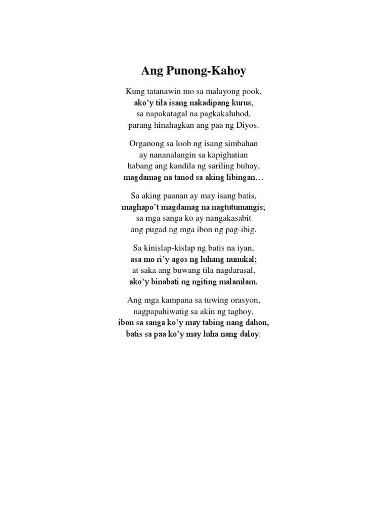 Trunk of a tree. Give your interpretation of the select poem of ang punong kahoy by. Ang tulang Isang Punongkahoy ni Jose Corazon de Jesus ay naghahalimbawa sa kanya sa isang punong kahoy.