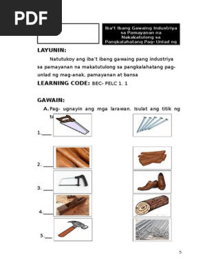 1 Hanapbuhay 2 Kapitbahay 3 Bungang kahoy 4 Hating gabi 5 Takdang aralin Talk from BEED 3050 at University of the City of Marikina Pamantasan ng Lungsod ng Marikina Study Resources. May ibat ibang kasangkapang kailangan sa paggawa ng mga bagay na yari sa kamay. Nagpapaapoy sila gamit ang kahoy tapos ilalagay nila sa palayok yung pagkain tapos na.